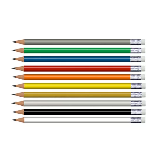 Painted pencil of PEFC certified wood, available round, six- or three-sided, with colorful eraser (varied choice of colors), also available short (9,5cm) or without eraser (price on request)