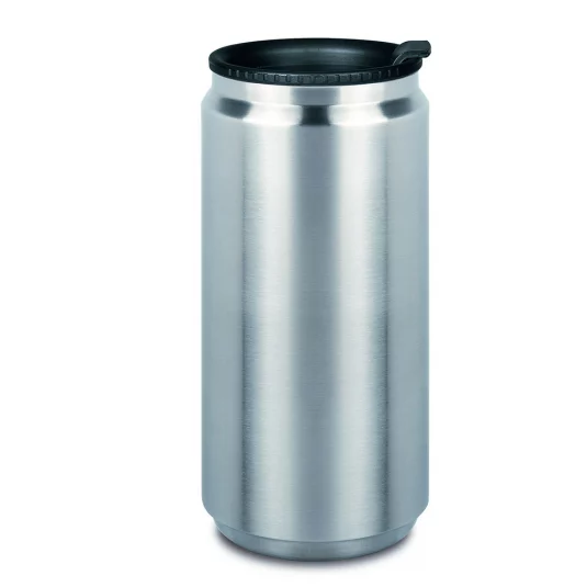 Funny vacuum-insulated thermal mug in the shape of a drink can, of double-walled stainless steel, with practical drinking lid