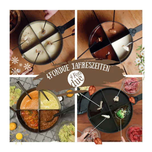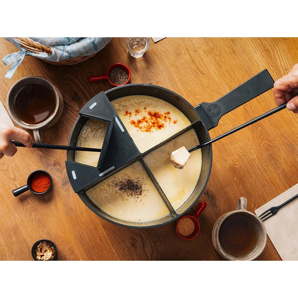Designed in Switzerland – innovative cast iron fondue caquelon with four separate compartments, bringing maximum variety to the table!
