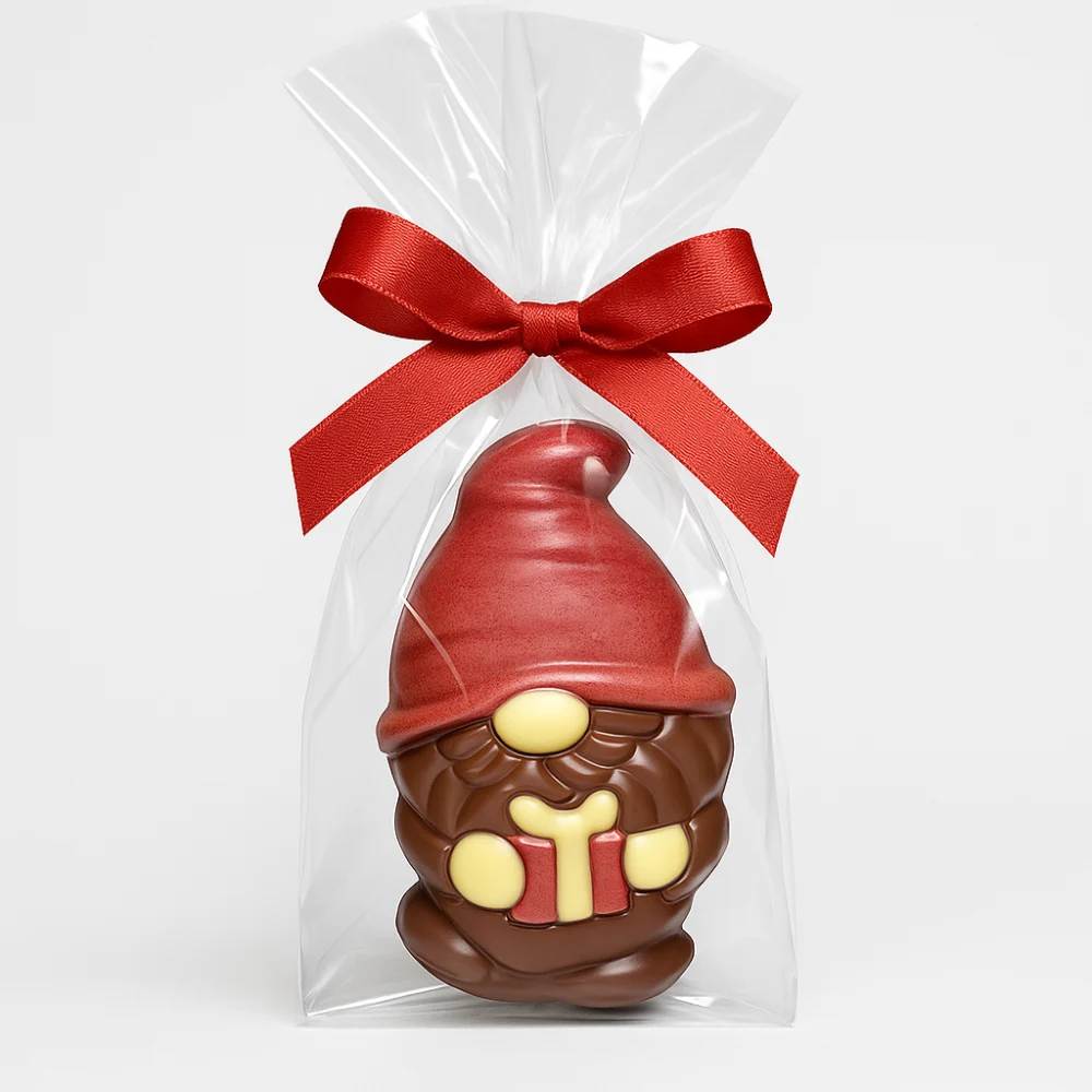 Festive elf, made from Grand Cru Madagascar organic milk chocolate (38%), decorated with white chocolate, packaged in a cellophane bag with a red gift bow, shelf life approx.