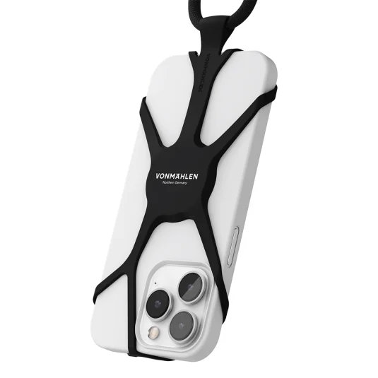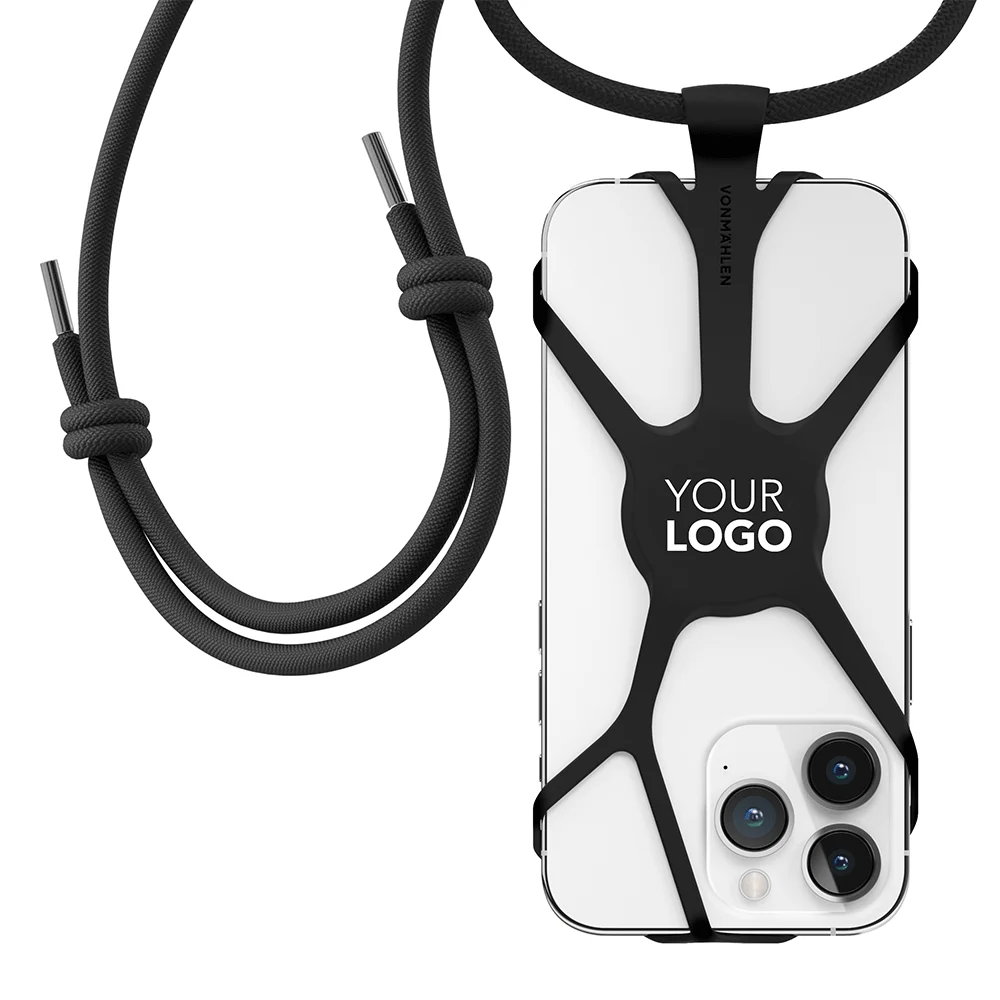 Trendy, universal smartphone chain made of hard-wearing silicone and an adjustable (up to 150 cm) nylon cord (55% recycled materials) with knot design, compatible with all common mobile devices