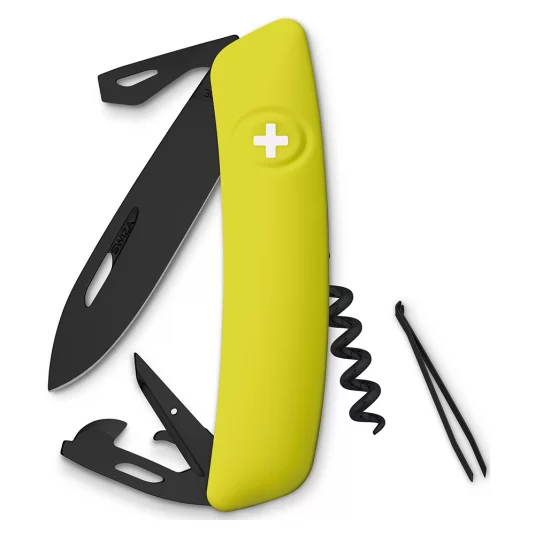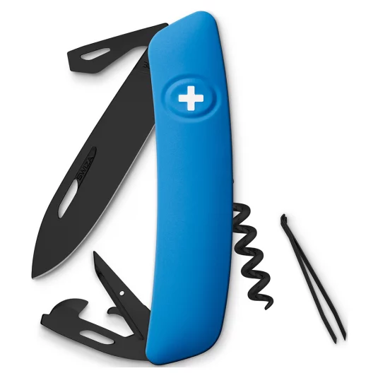 Fonctions: Couteau, fil de perçage et de perforation, poinçon, décapsuleur, chas, ouvre-boîte, tournevis plat n ° 1, tournevis plat n°3, tire-bouchon, pince à épiler