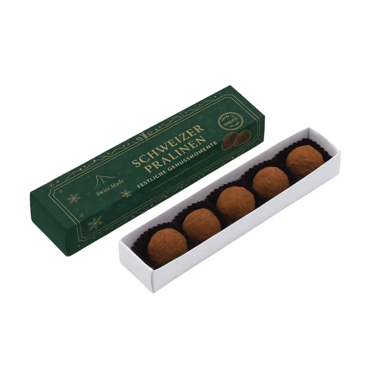 Moments de plaisir festifs – Barre de chocolats avec 6 truffes suisses bio classiques (sans alcool ; 2× noir, 2× lait entier, 2× blanc), emballées dans une boîte en carton de haute qualité avec un couvercle coulissant pratique, durée de conservation environ 8 semaines