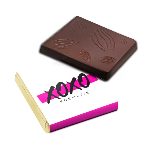 Swiss Made - Tablettes de chocolat fondantes en fin chocolat au lait BIO Grand Cru de Madagascar 38%, emballées de manière durable dans du papier naturel ECO (emballage primaire) ainsi que dans une enveloppe en papier à coques de cacao ECO (emballage secondaire), contenu 5g, durée de conservation 12 mois, quantité minimale de commande 600 pièces.