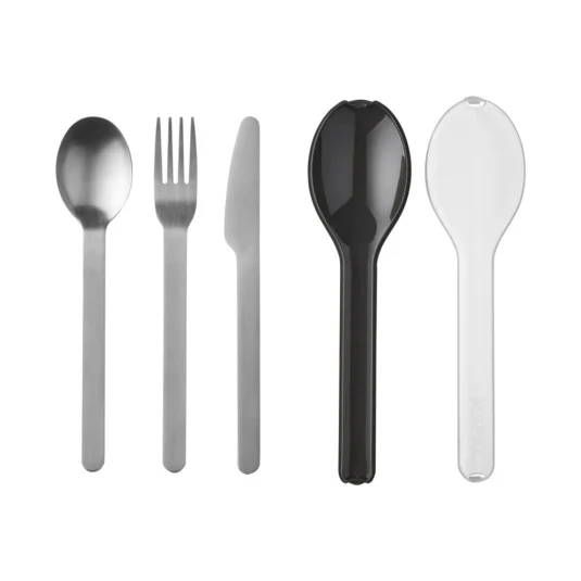 Set de couverts 3 pièces en acier inoxydable ; avec couteau, fourchette et cuillère, rangés de manière compacte et protégés dans un étui en plastique original et réutilisable, lavable au lave-vaisselle.