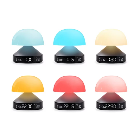Réveil design et élégant en aluminium, avec une agréable simulation de lever/coucher de soleil, 9 réglages de couleur de LED différents et variables ainsi que des mélodies de réveil douces et naturelles, avec écran LCD, fonction Touch/Snooze et une autonomie de 4 mois sans recharge, livré avec câble USB-C