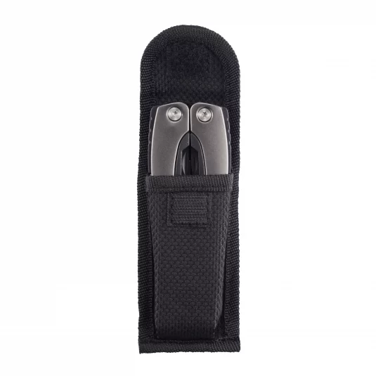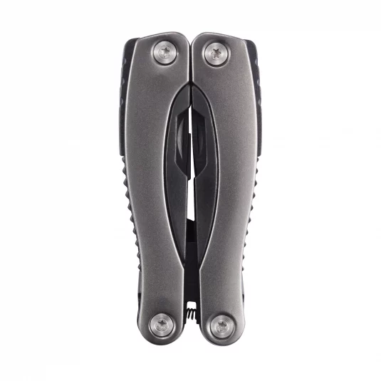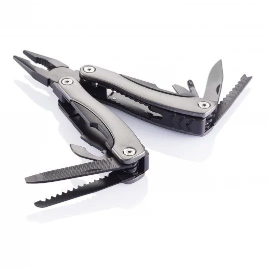Multitool en acier inoxydable noir avec poignée en aluminium, comprennant 14 fonctions différentes.