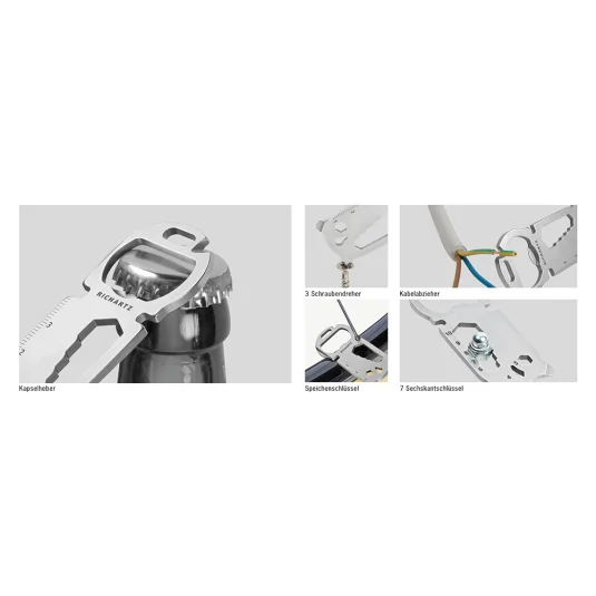 Petit outil multifonctionnel pour le trousseau de clés en acier inoxydable avec 16 fonctions ; décapsuleur, petit et grand tournevis à fente, tournevis cruciforme, extracteur de câble, deux clés pour les rayons de vélo, sept clés hexagonales, centimètre et arrache-clou