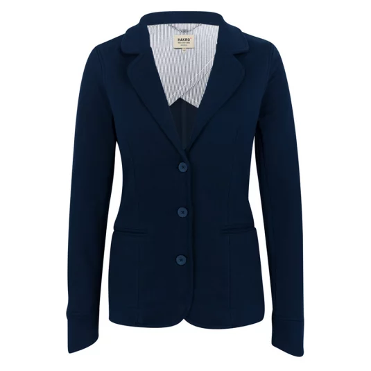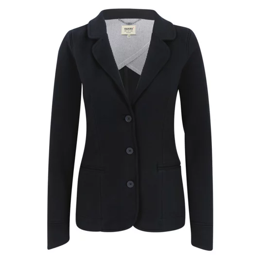 Sweatblazer taillé mode à deux boutons avec pinces pour une forme parfaite, poches passepoilées, dos avec fente couverte, manches avec pinces aux coudes, doublure partielle en tissu rayé, intérieur non-gratté (french terry) et chaînette de suspension métallique à l’intérieur du col.