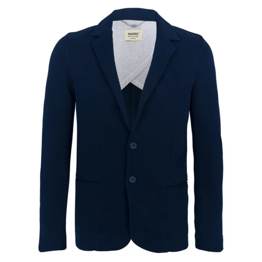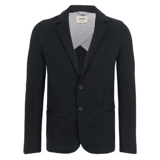 Sweatblazer taillé mode à deux boutons avec pinces pour une forme parfaite, poches passepoilées, dos avec fente couverte, manches avec pinces aux coudes, doublure partielle en tissu rayé, intérieur non-gratté (french terry) et chaînette de suspension métallique à l’intérieur du col.