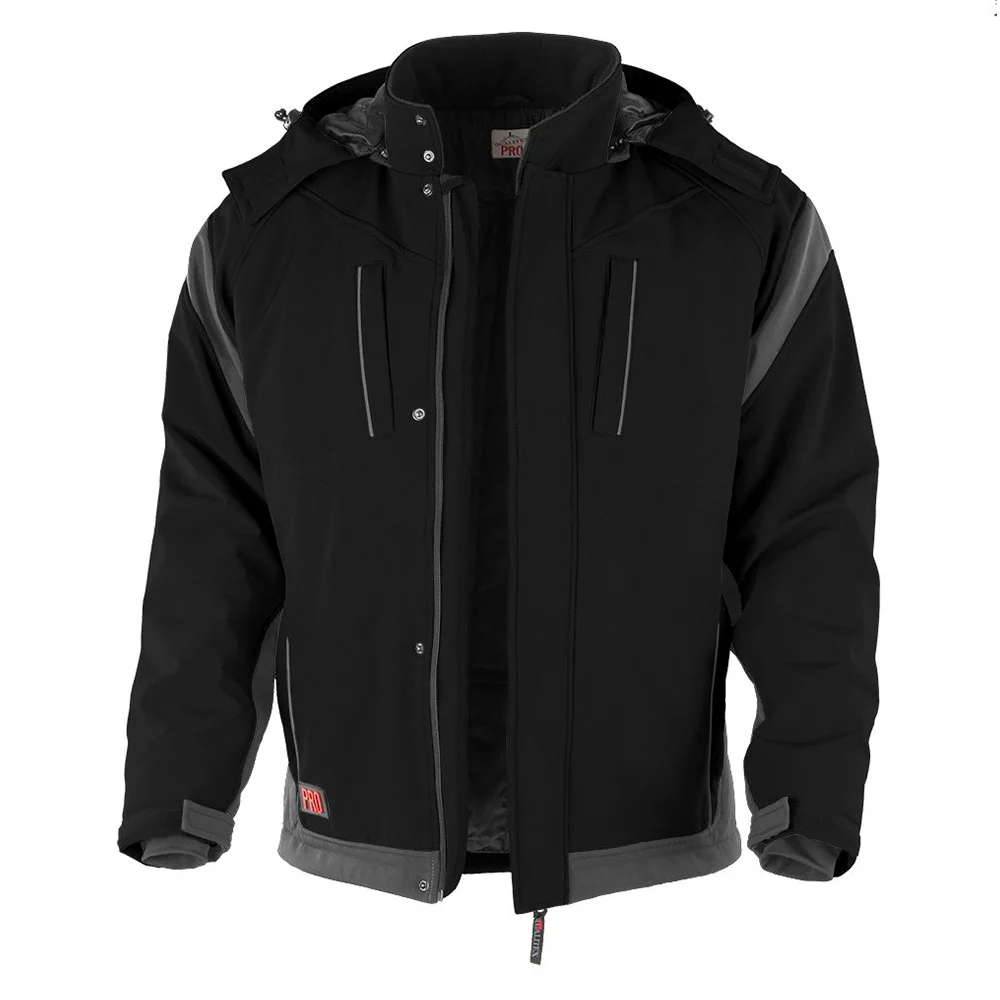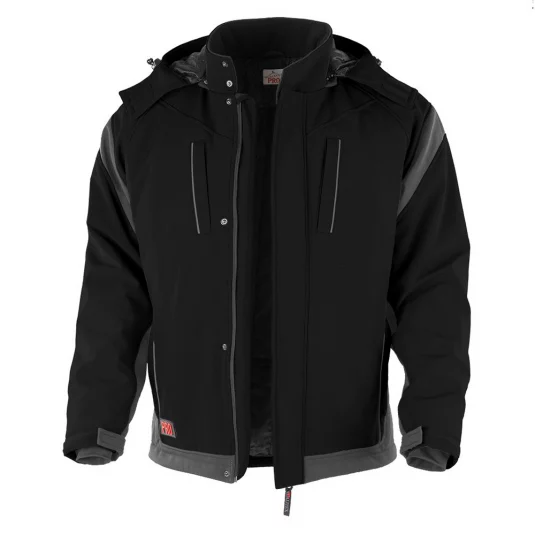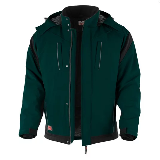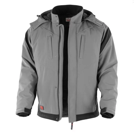 Veste softshell avec capuche amovible, col relevé avec 2 pressions, 2 poches de poitrine et 2 poches latérales avec fermeture éclair en plastique dissimulée, fermeture éclair à sens unique YKK dissimulée avec protection du menton et 4 pressions, bandes réfléchissantes.