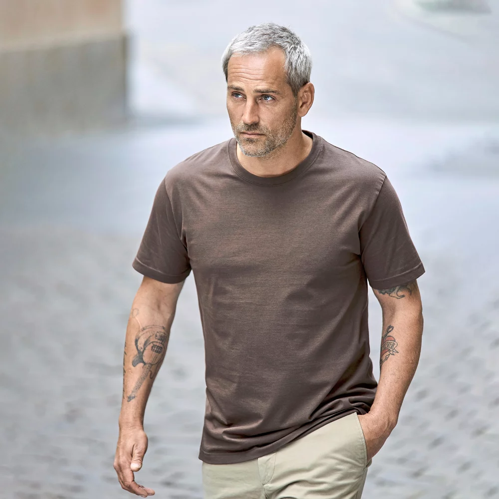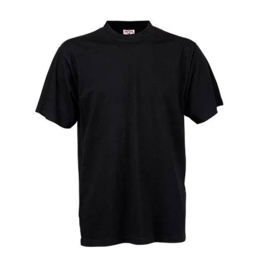 T-shirt classique à col rond, bande de col épaule à épaule, bande de col double épaisseur avec élasthanne, sans coutures latérales, prérétréci.