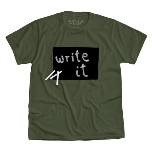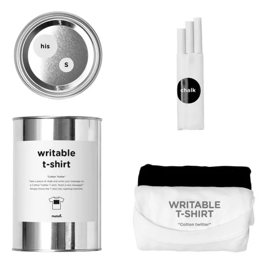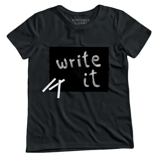Un t-shirt avec un tableau noir destiné à y inscrire votre message à l’aide d’une craie blanche.