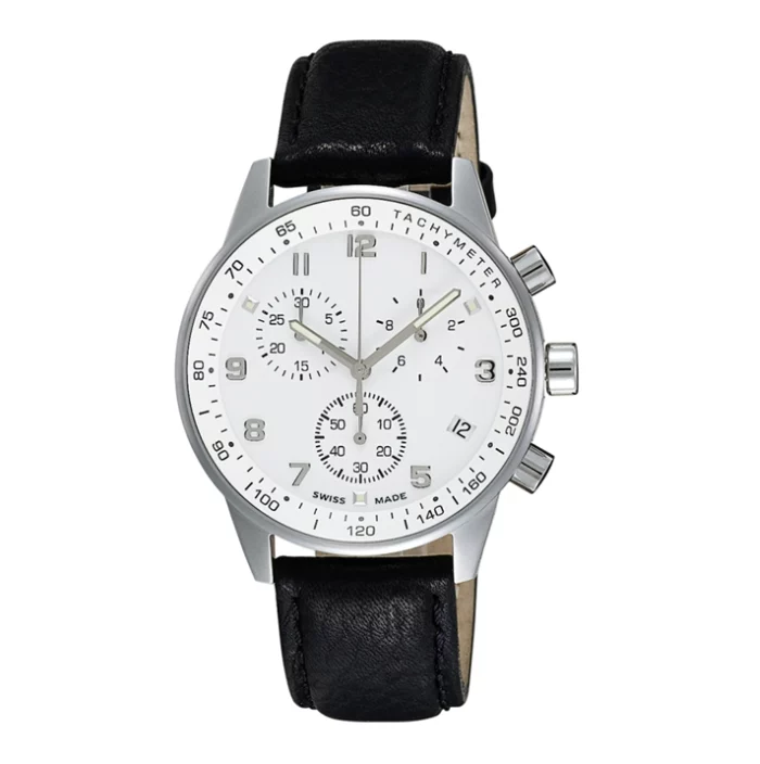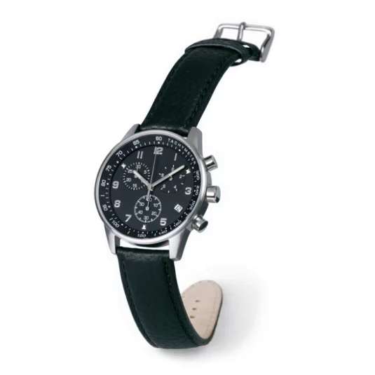 Swiss Made Chronographe Verre minéral Boîter acier plaqué Etanche jusqu'à 50 m Mouvement quartz Date Bracelet cuir Cadran noir Finitions spéciales telles que bracelet en acier ou cuir et boîte d'emballage de qualité suppérieur disponible sur demande en supplément de prix!