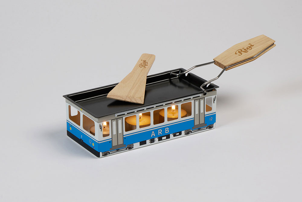 Ein Kerzenraclette in Form eines originalgetreu gestalteten Arth-Rigi-Bahn-Triebwagens – ausgestattet mit Holzgriff, Schüfeli und passendem Etui. Hier verschmelzen authentisches Schweizer Bahndesign, traditionelles Käsehandwerk und funktionales Produktdesign zu einem einzigartigen Genuss- und Sammelobjekt mit Unikatcharakter.